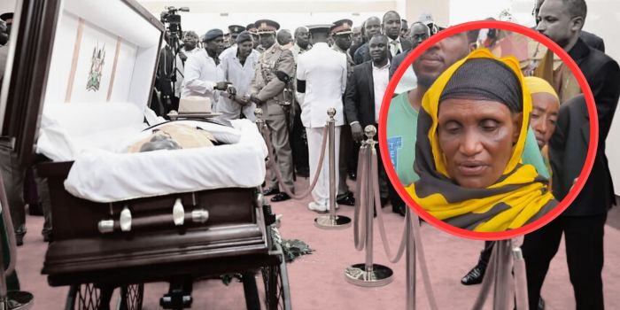 Former Prime Minister Raila Odinga lying in state at the Moi International Sports Centre, Kasarani, and an insert of Boni Bori, mother to 42-year-old Jidah Burka, who was shot and killed at the stadium during the public viewing on October 16, 2025.