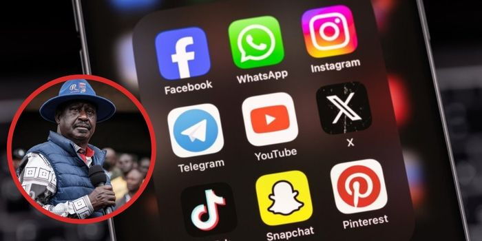 A screengrab of social media platforms on a phone and an insert of former Prime Minister Raila Odinga.