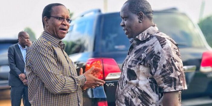 Interior Principal Secretary Karanja Kibicho(L) and Interior CS Fred Matiang'i during a meeting on February 28, 2020.