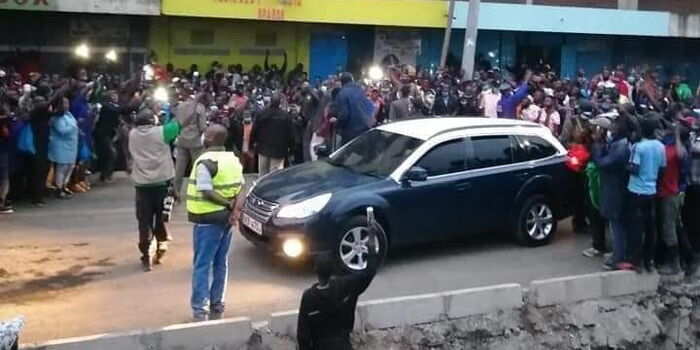 Uhuru sat on the roof of the car on the driver’s side as he interacted with the crowd with his security team struggling to contain the crowd.