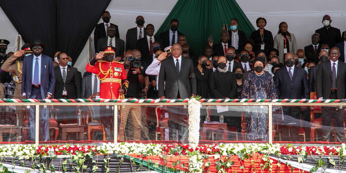 Thousands of mourners, led by President Uhuru Kenyatta and First Lady Margaret Kenyatta, follow proceedings at the National Funeral Service of former President Emilio Mwai Kibaki at Nyayo National Stadium on Friday, April 29, 2022