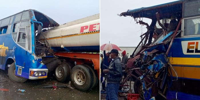 Two people were reported dead on Saturday, April 6, after a 62-seater bus they were travelling in hit a fuel tanker along the Muguga area in Kikuyu, Kiambu County.
